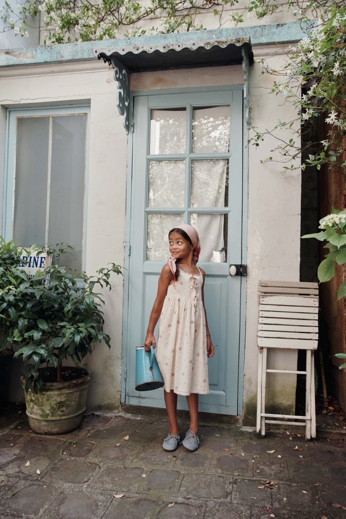 オーガニックコットンのコットンボイルに、ピンクを基調とした花束と小花のプリントをあしらったドレス。 生成り(エクリュ)のやわらかな色合いと、軽やかな素材感が重なり、夏の日差しに映える爽やかな一着です。 裏地付きでありながら、暑い日にも涼やかに着られる心地よさも魅力です。 ・華奢なストラップデザイン ・スクエアネックの身頃 ・スカラップフリル縁のリボン開閉(胸元) ・ゆったりとしたスカートシルエット ・胸下切り替えのギャザースカート ・ミモレ丈 ・サイドは袋縫い仕立て(肌あたりのやさしい仕様) 素材 オーガニックコットン 100% ⸻ お手入れ方法 ・裏返して30℃以下の水温でデリケート洗い ・漂白剤使用不可 ・乾燥機使用不可 ・低温アイロン可 ・ドライクリーニング不可 【ブランドからのご案内】 本製品は、オーガニック糸を使用した先染め生地で製作されています。製法の特性上、ブルーのチャコペン跡のように見えるものやペン跡のような線、黒〜グレーの小さな点、わずかな色の濃淡が見られる場合がございます。 いずれも不良ではなく、生地本来の特性によるものとなります。あらかじめご了承のうえご検討ください。