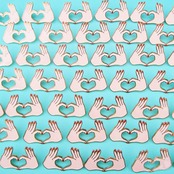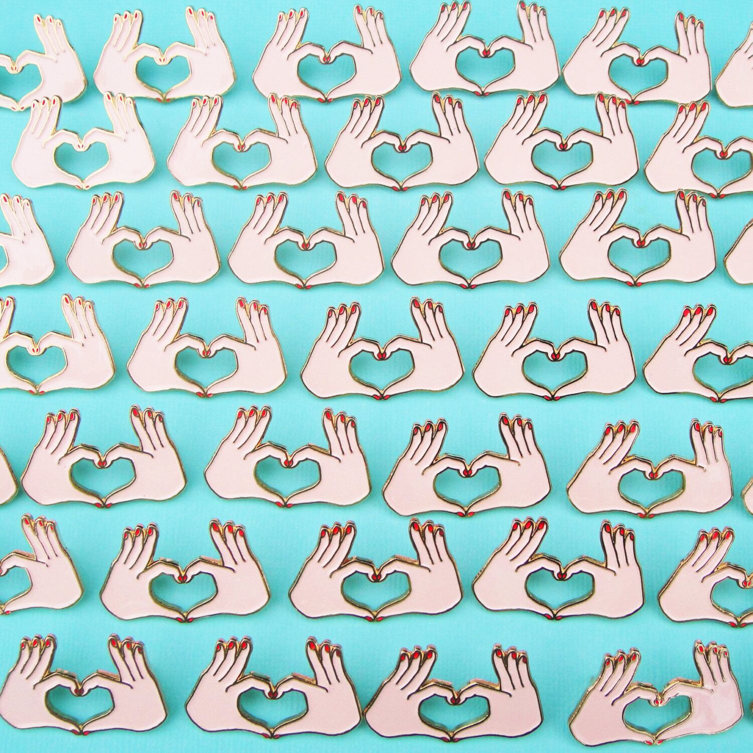 指でハートを作る可愛らしい手のモチーフが印象的なピンバッジ。