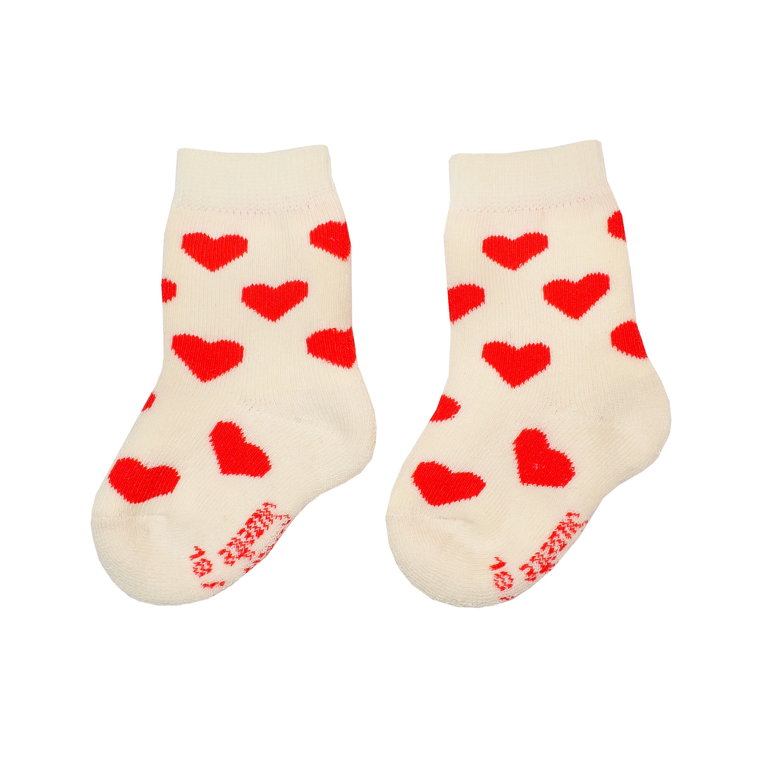 愛らしい赤いハートが並ぶ、ロマンティックなクリーム色のソックス。大切な人へのギフトにもぴったりな、気持ちを伝えるデザインです。