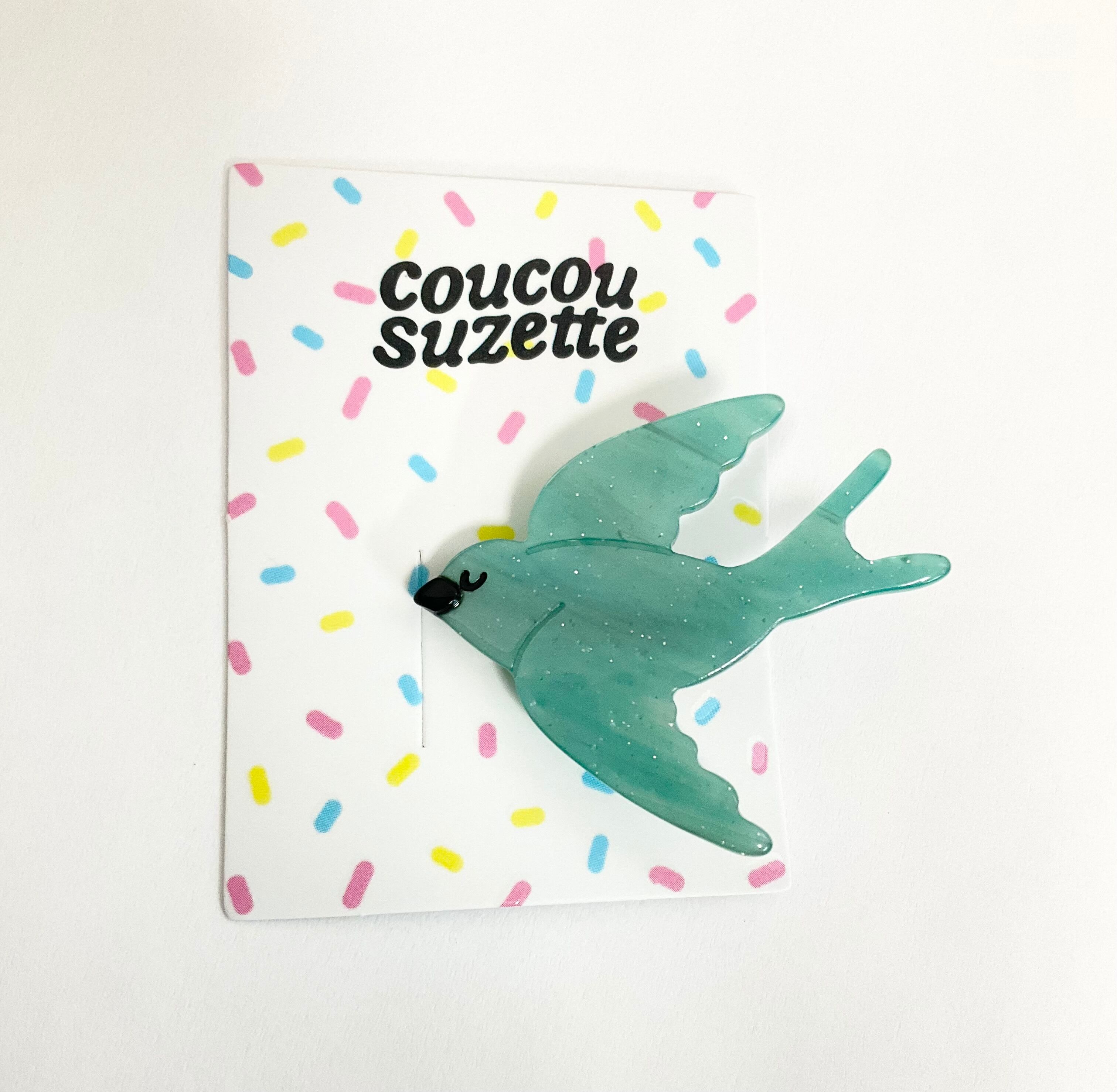 エメラルドグリーンとブルーが溶け合うような色合いと、広げた翼のフォルムが印象的なツバメのヘアクリップ。陽の光できらめくラメのディテールが、ヘアスタイルにさりげないアクセントを添えてくれます。