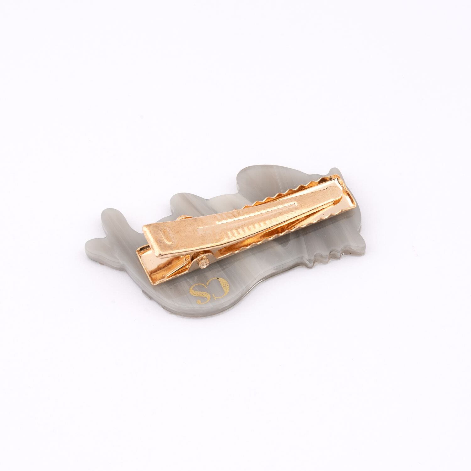 このグレーの猫クリップを髪に留めれば、まとめ髪もきちんとキープ。