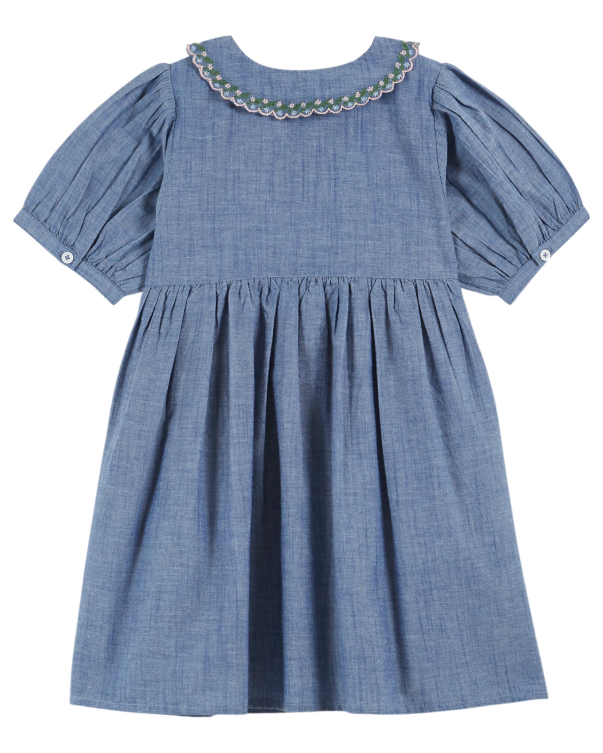 繊細なはしごレースのラインが織り込まれた、ブルーのシャンブレーコットンで仕立てたドレス。