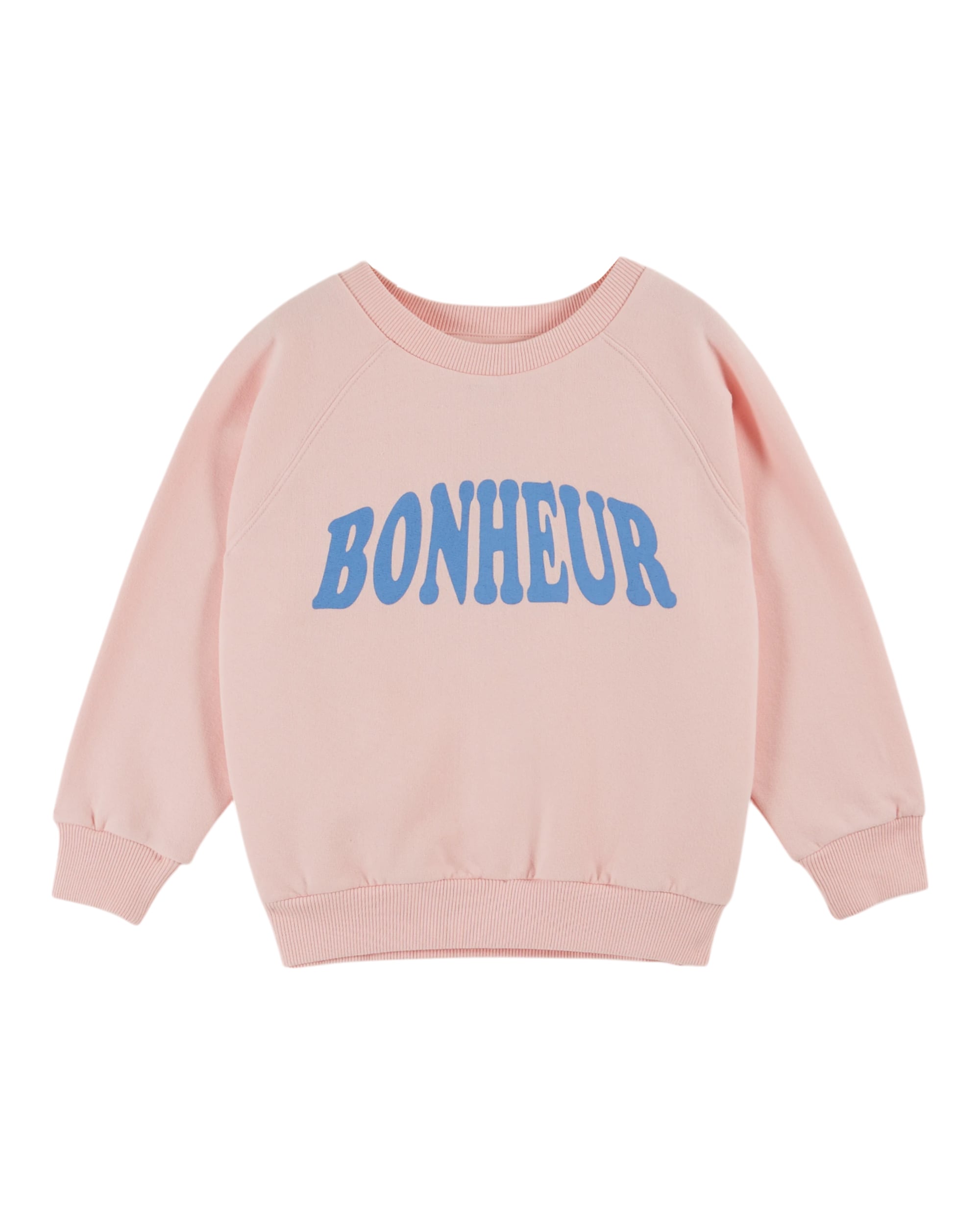 胸元にブルーで大きく「BONHEUR」とプリントされた、柔らかなピンクのオーガニックコットン・スウェットシャツ。