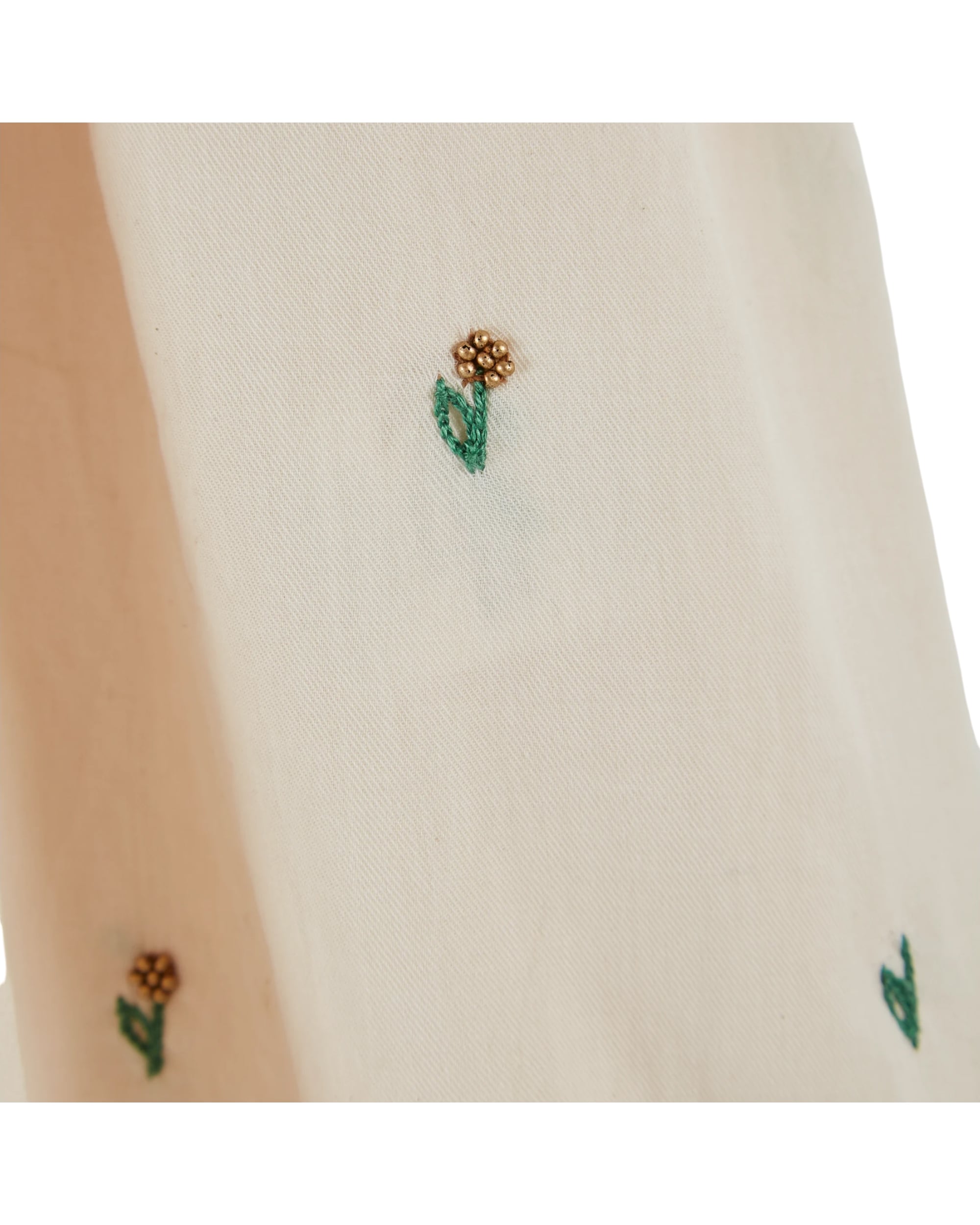 繊細なクリームカラーのコットンガーゼに、ゴールドビーズの小花刺繍を全体にあしらったワンピース。